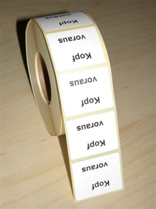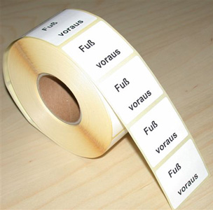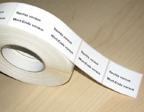 Etiketten, die quer auf dem Trägerband haften, können mit dem „Fuß“ der Schrift zuerst von der Rolle laufen oder aber „kopfüber“ stehen. |
